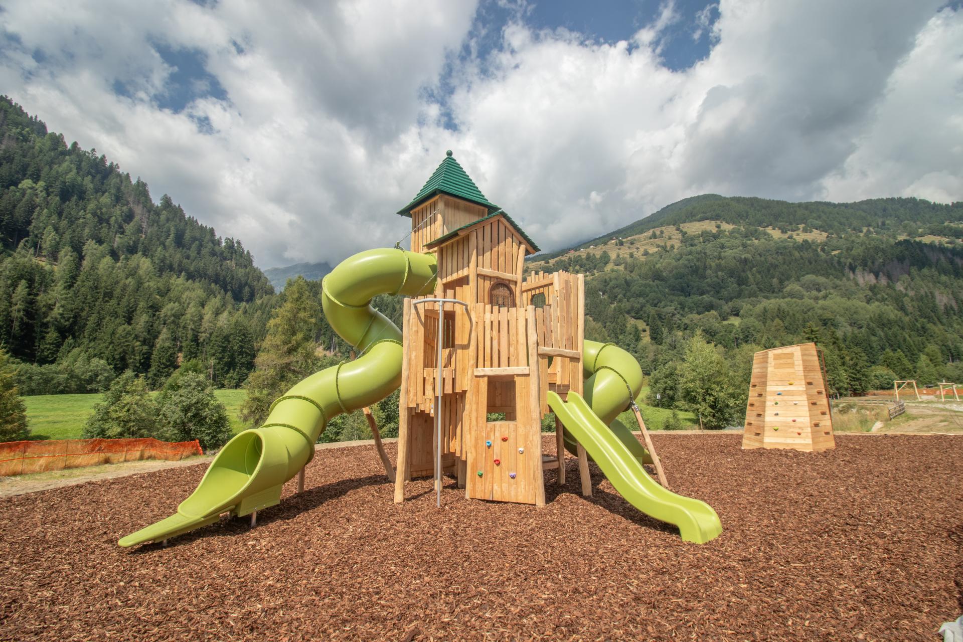 Dit mooie kasteel met groene glijbanen is gemaakt van duurzaam robinia hout