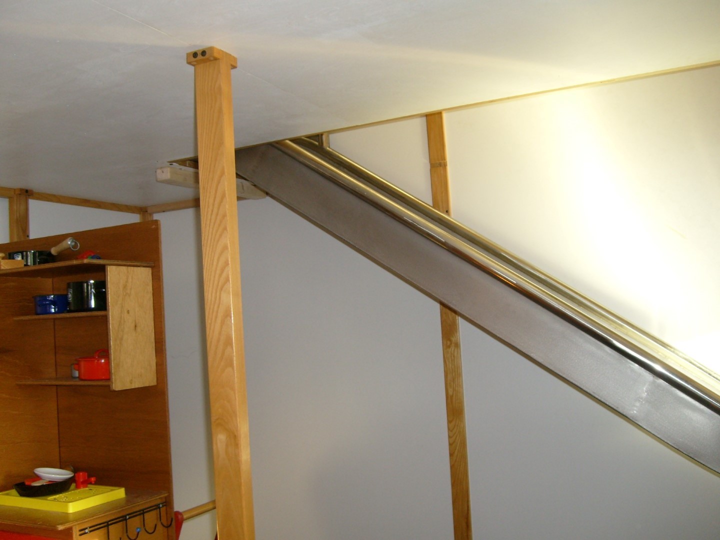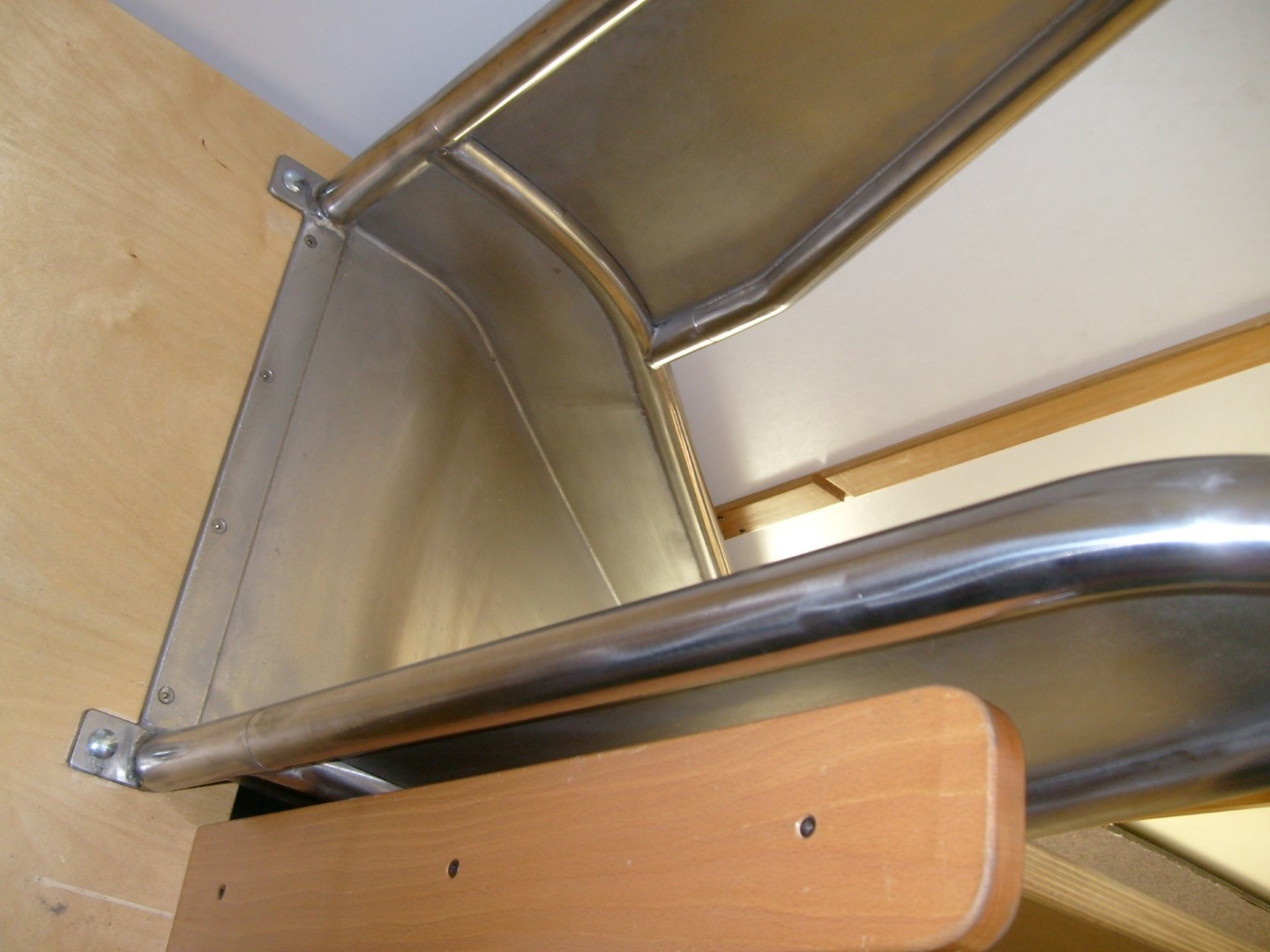 Een leuke uitdaging om een veilige RVS glijbaan te plaatsen in een kinderopvang op de 3e verdieping van een kantoorpand. De RVS glijbaan via de brandtrap naar boven en gemonteerd op een bestaand platform van 150 cm hoogte (vervanging onveilige glijbaan). Lengte ca 260 cm, breedte ca. 50 cm