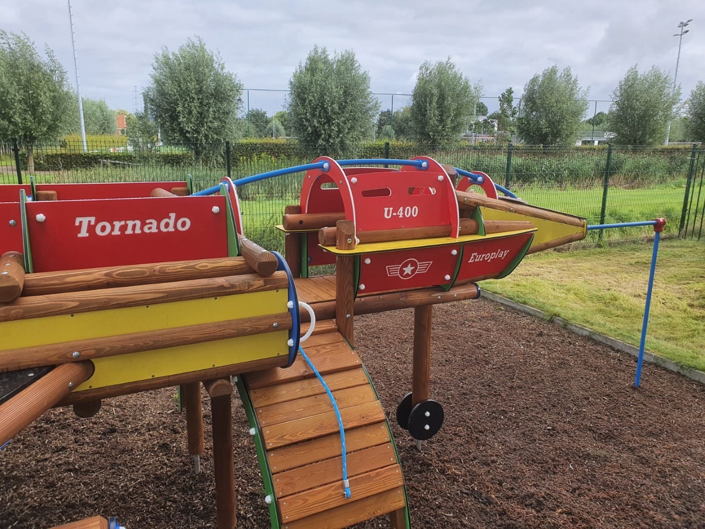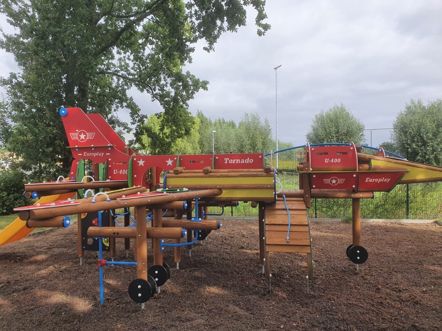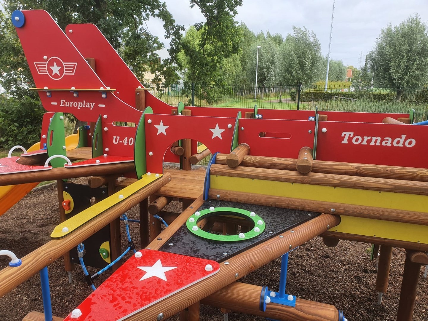 Het speeltoestel U401A Tornado in de vorm van een straaljager voor kinderen van 4 tot 10 jaar. De straaljager biedt een enorme waaier aan speelmogelijkheden. Kinderen kunnen overal doorklimmen en klauteren. Er is vooraan een duikelrek voorzien. De cockpit bevat een stuur en kan bereikt worden via een klimnet of klimboog. Aan de zijkanten van de straaljager zijn 2 kruiptunnels. Achteraan het toestel is er een wiebelbrug, evenwichtsnet en klimmuur. Kinderen kunnen de straaljager verlaten via de kunststof glijbaan. De panelen zijn in HDPE Polyethyleen. Alle moeren en bouten worden volledig afgescherm met kunststof afdekdoppen. Alle metalen onderdelen zijn roestvrij voorbehandeld en polyester gecoat.