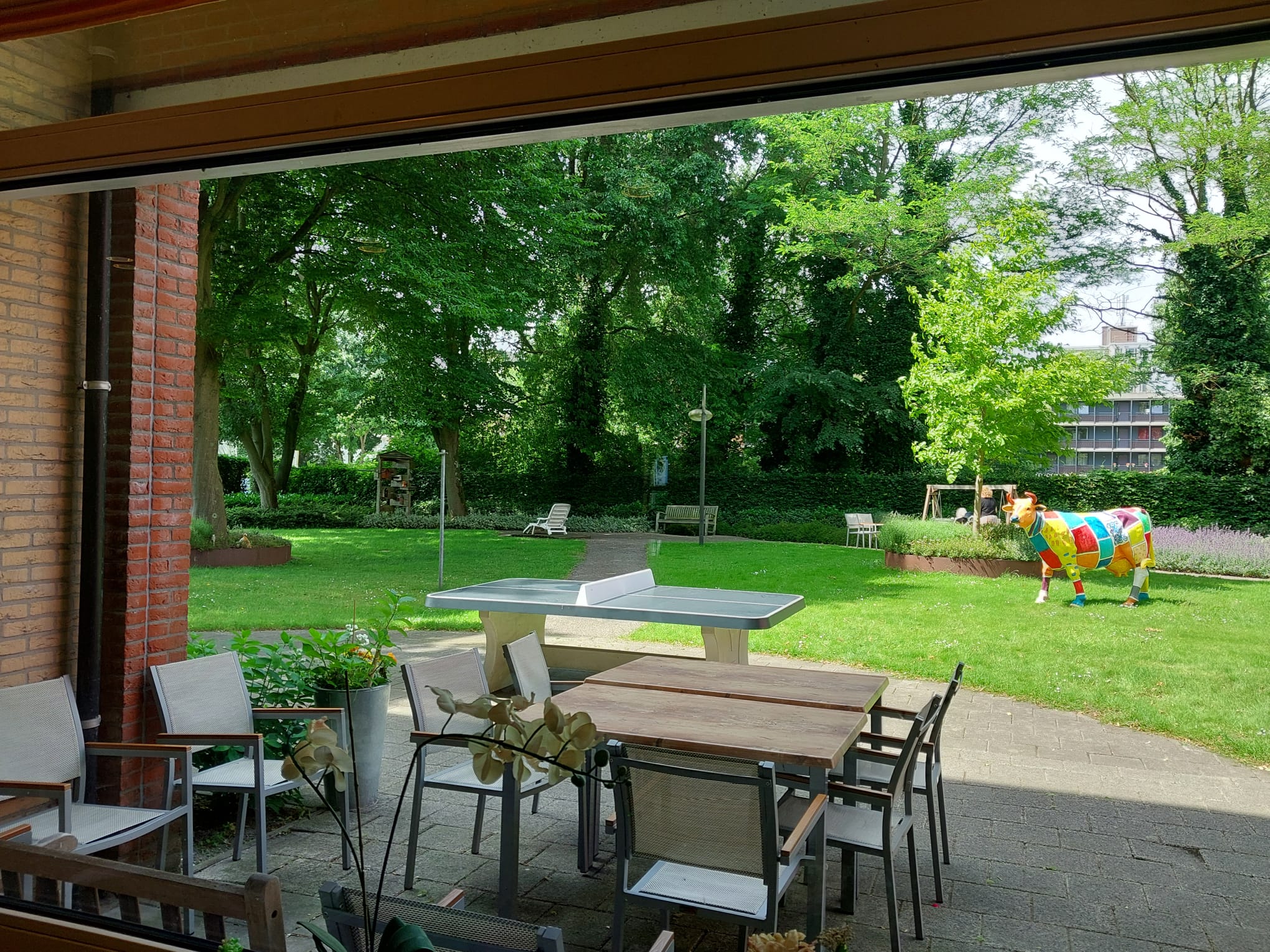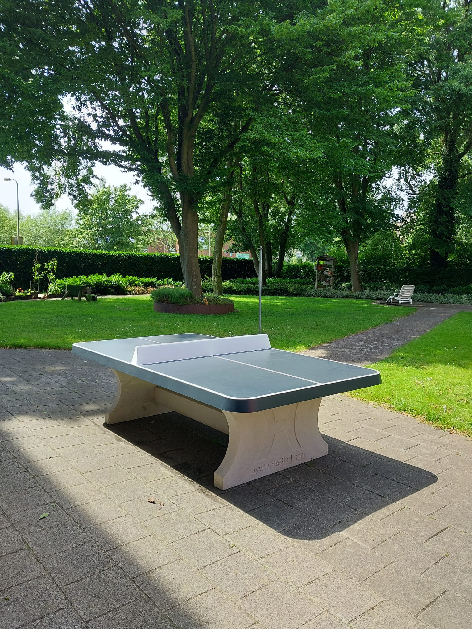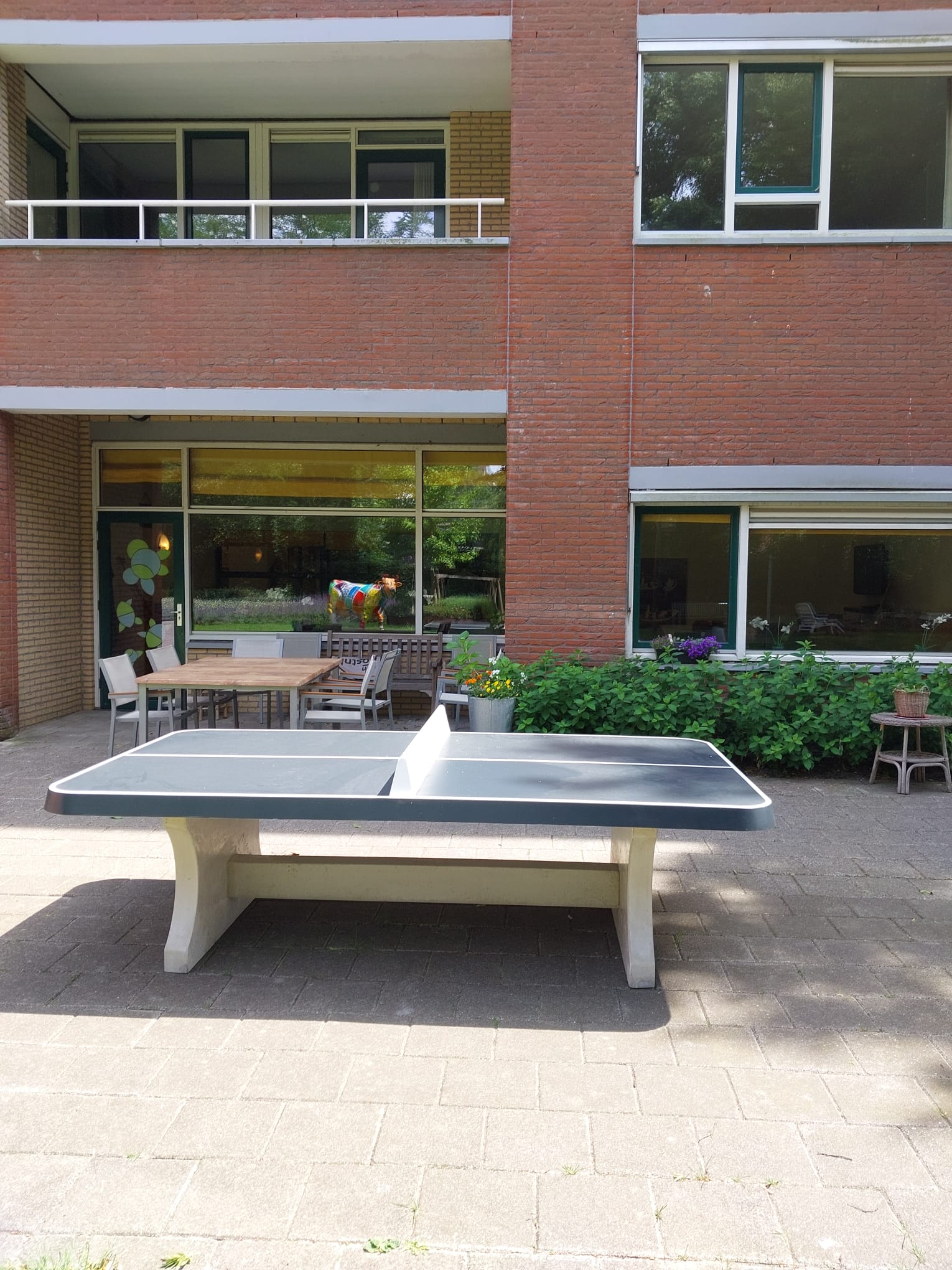 In opdracht van een zorgcentrum hebben wij een robuuste betonnen pingpongtafel met afgeronde hoeken in de kleur groen geplaatst in de binnentuin van het complex.