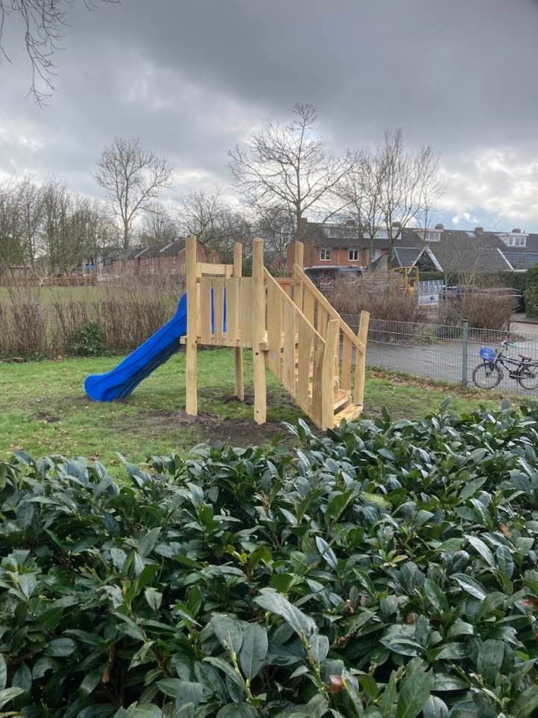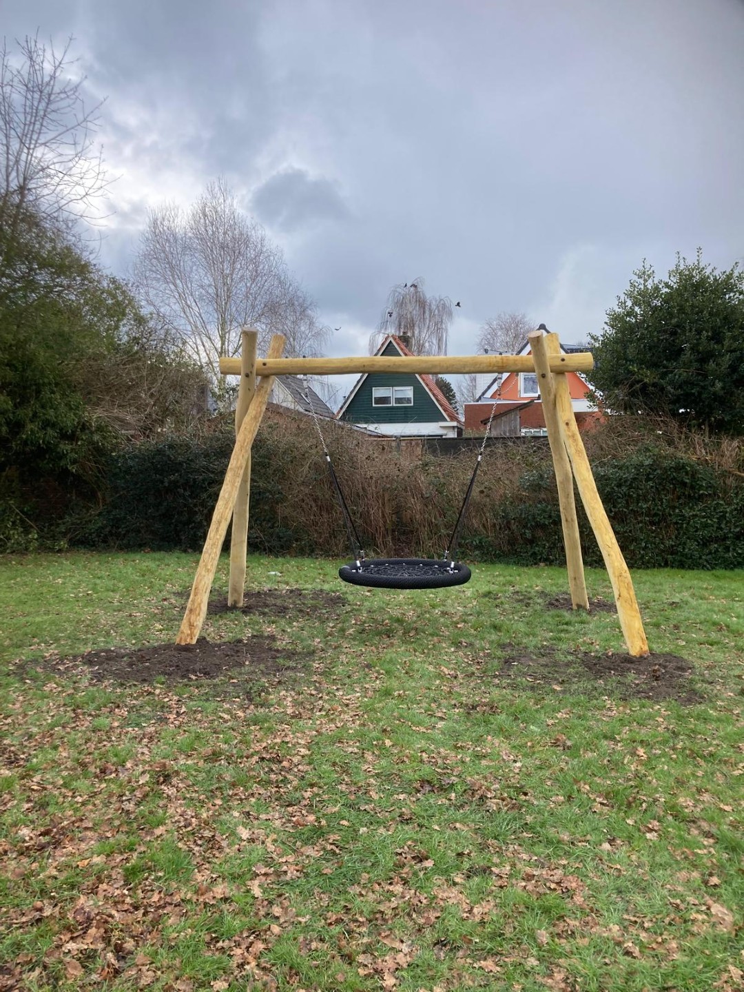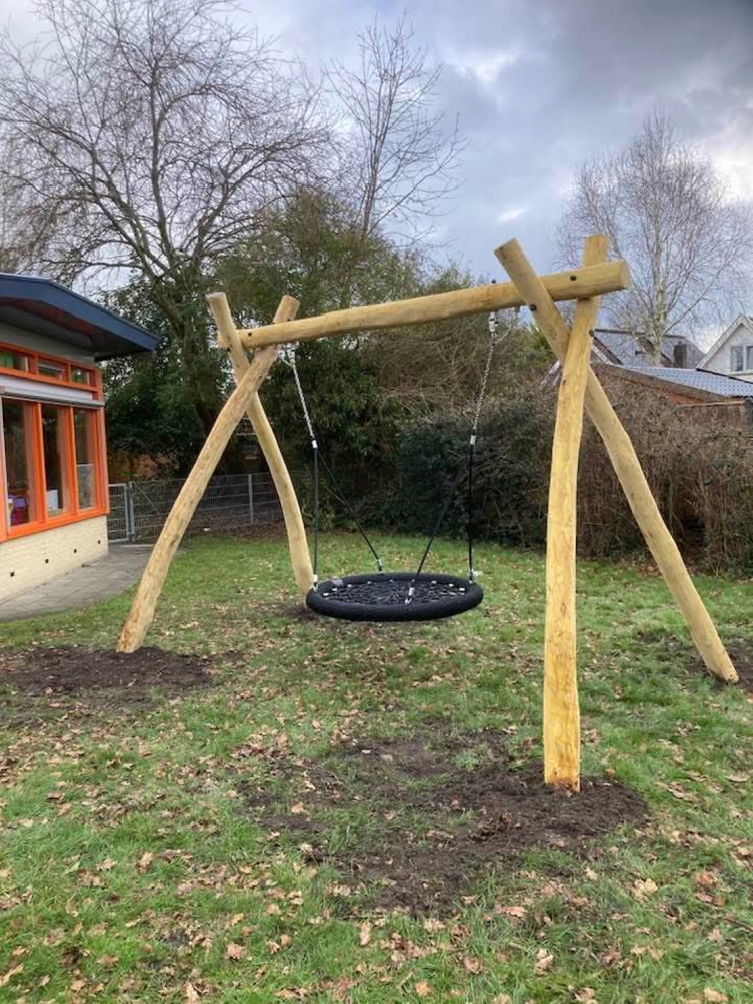 De kinderen kunnen daar nu heerlijk ravotten onder de grote boom en nu ook nog met speeltoestellen.