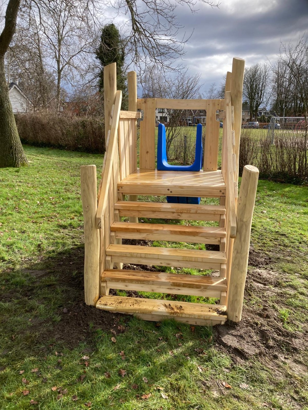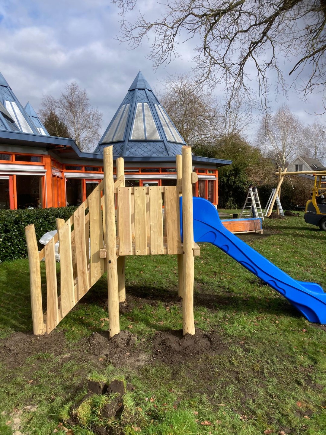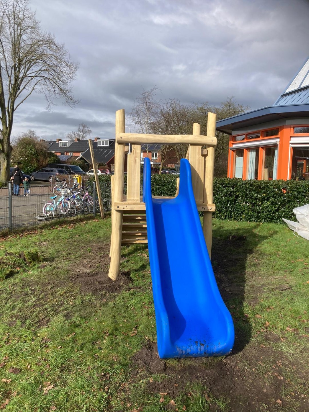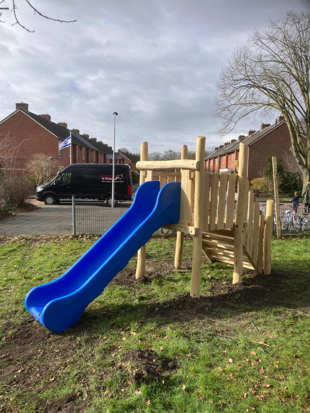 De kinderen kunnen daar nu heerlijk ravotten onder de grote boom en nu ook nog met speeltoestellen.