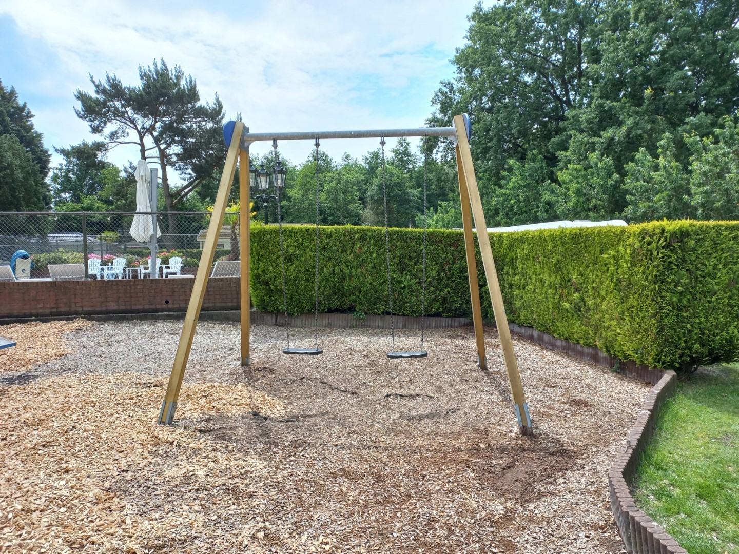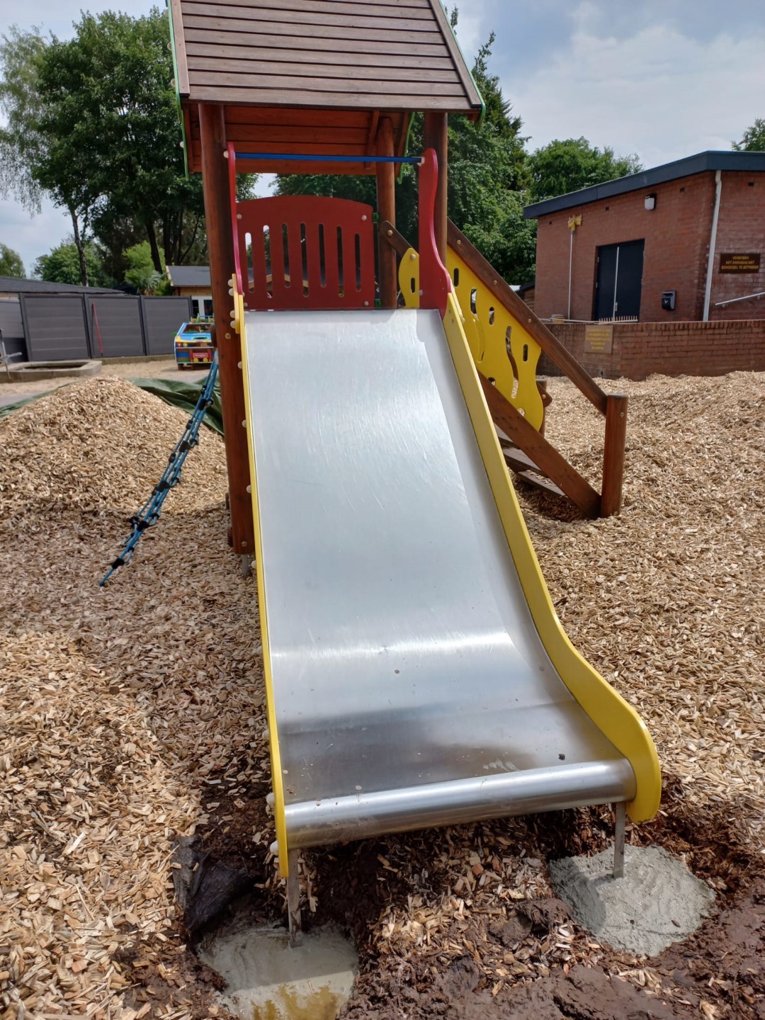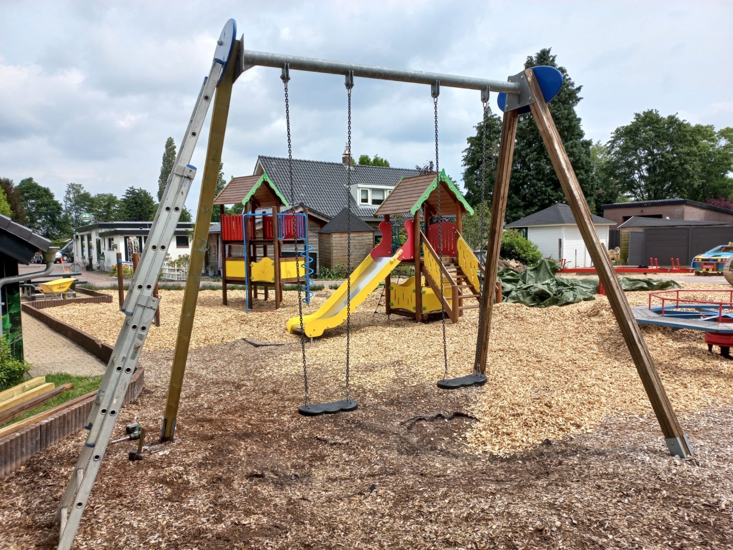 Moeder en dochter van dit chaletpark in Ermelo wilden graag een afspraak om mee te denken voor een bijzonder speeltoestel en de reparatie van enkele bestaande speeltoestellen en er waren ook nog houtsnippers nodig.