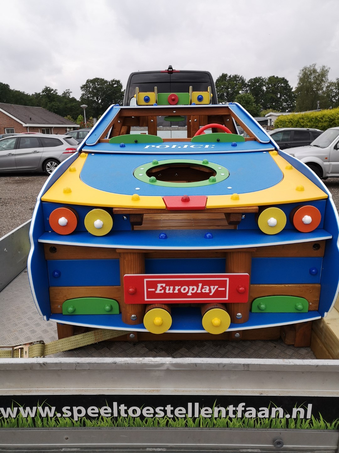 Speeltoestel in de vorm van een politiewagen voor kinderen van 2 tot 6 jaar. Kinderen kunnen via de ronde doorkruipringen in de wielen het speeltoestel betreden. Achteraan is er een inox glijbaan voorzien. De buitenkant van de politiewagen is volledig opgebouwd in HDPE polyethyleen. Het speeltoestel wordt bijna volledig voorgemonteerd geleverd. Alle moeren en bouten worden afgeschermd door kunststof afdekdoppen.