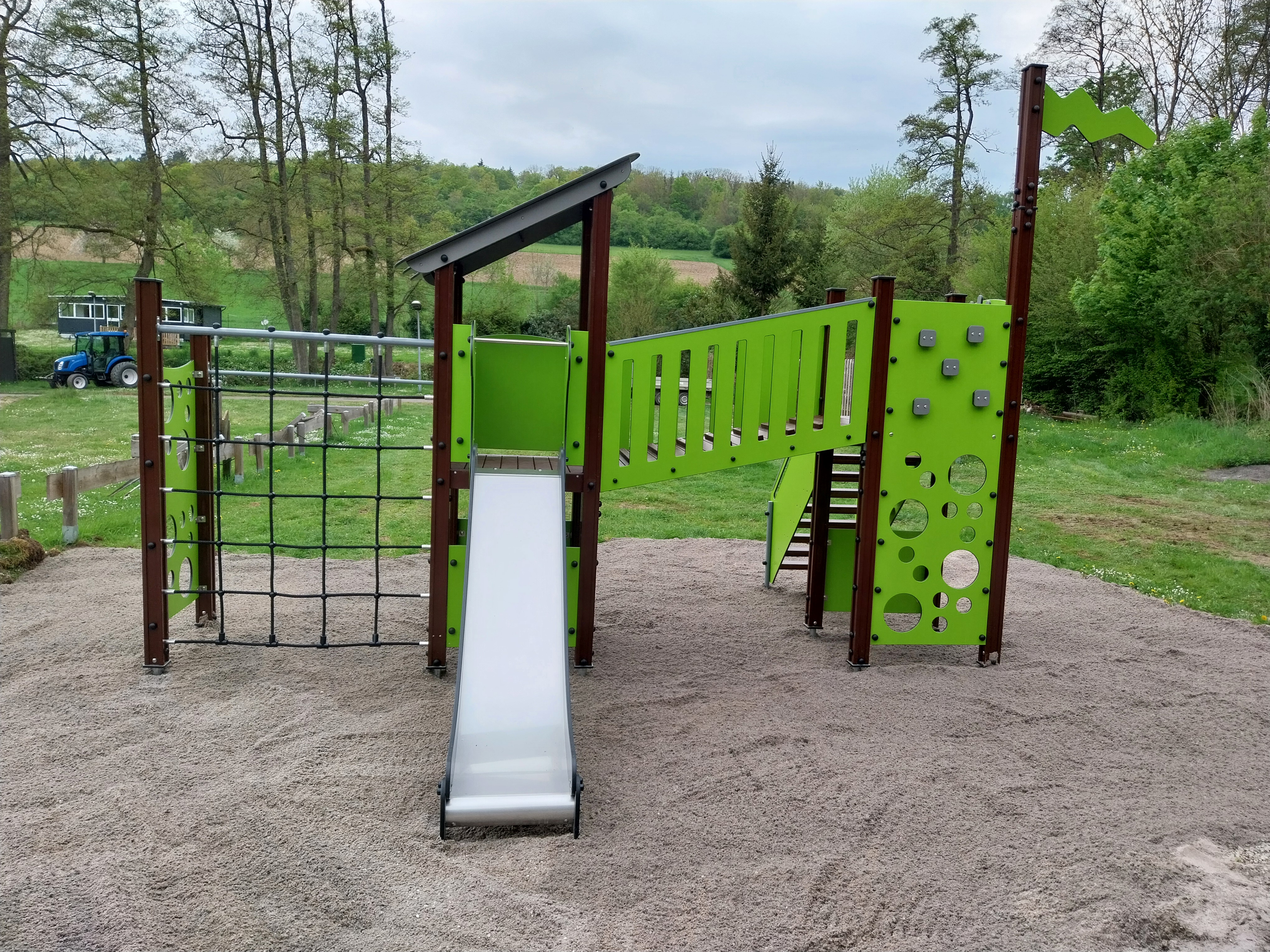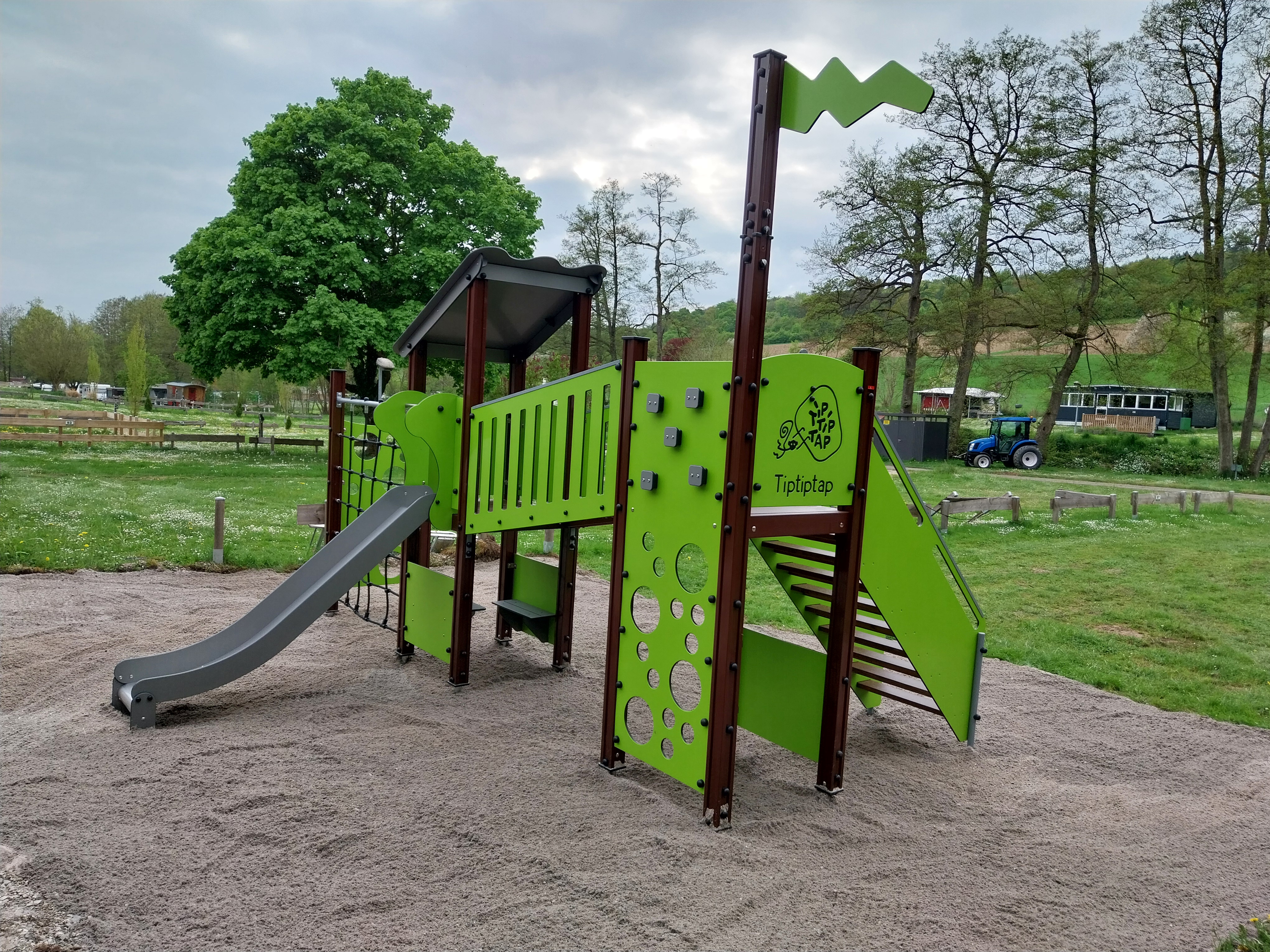 Al tijdens hun bezoek aan de recreatievakbeurs in Hardenberg waren de eigenaren van deze camping enthousiast over de frisse kleuren van de TIPTIPTAP speeltoestellen die wij daar toonden in de Forest Pistachio kleuren (groene beplating in combinatie met donkerbruin hout)
