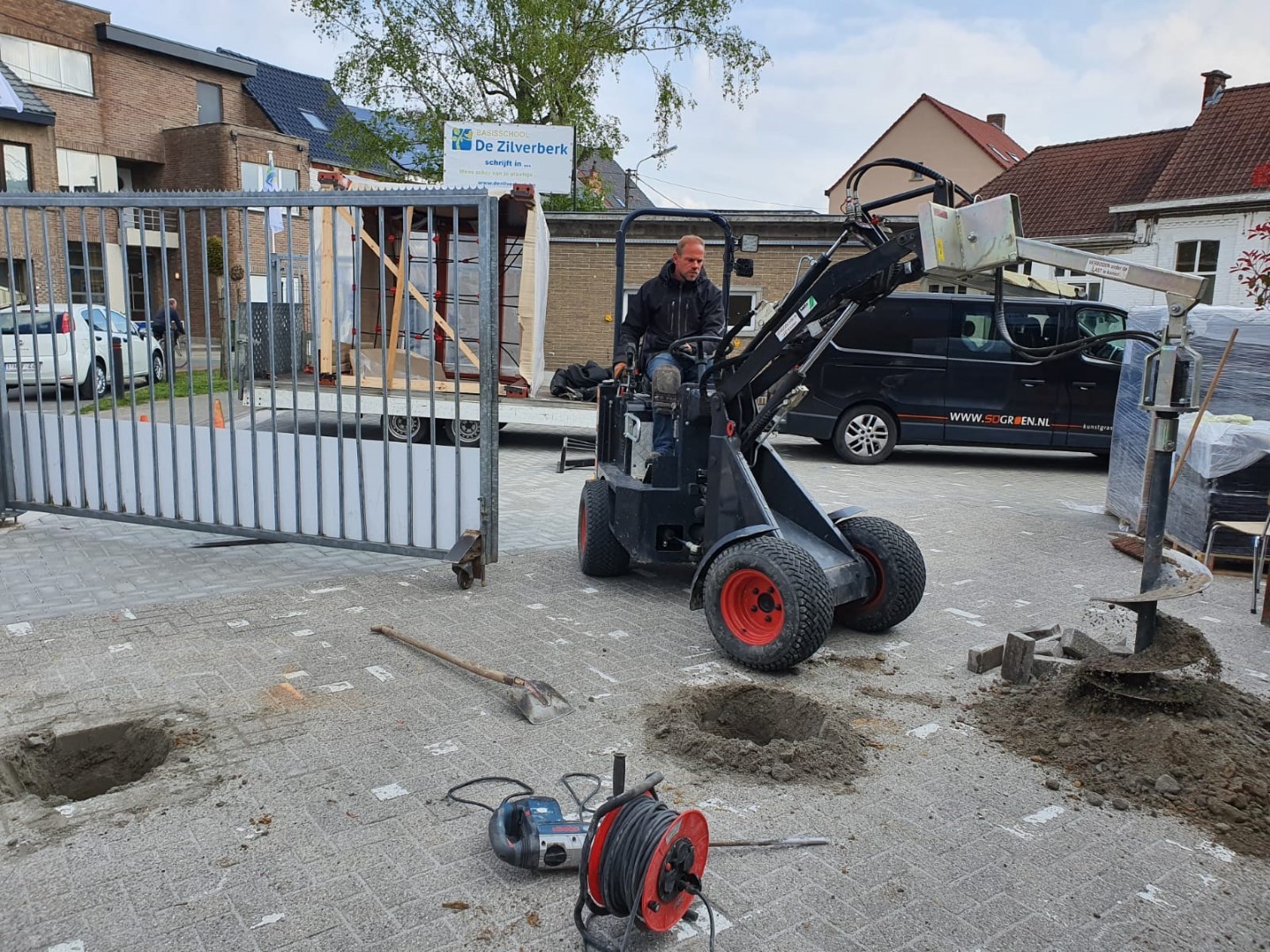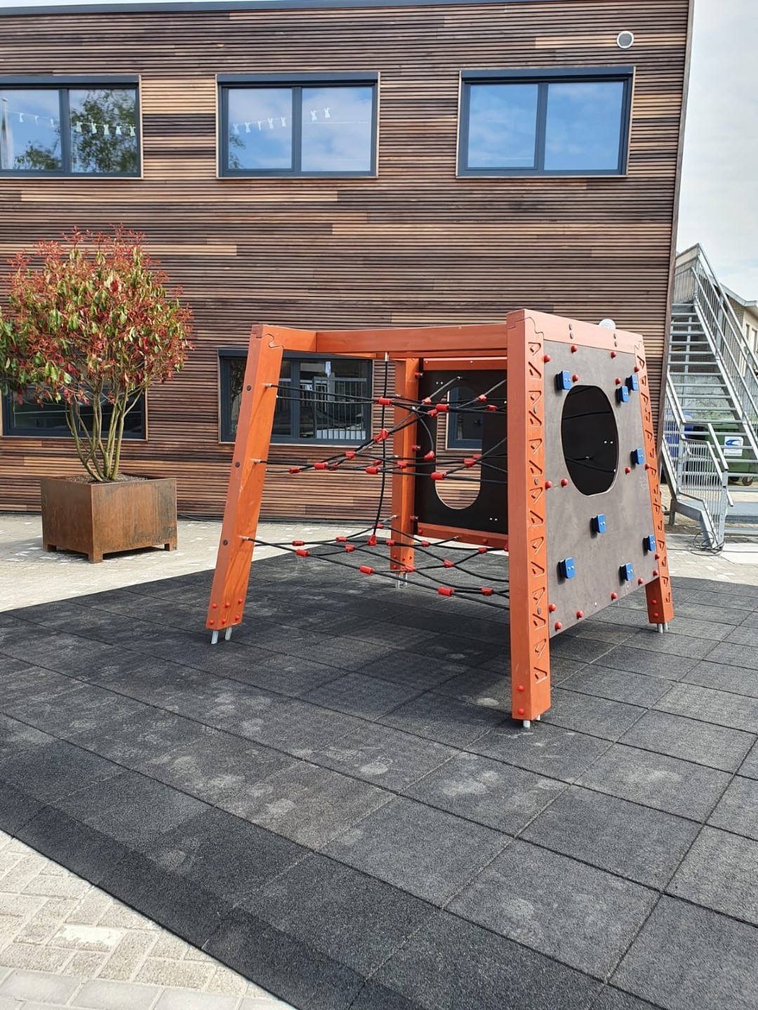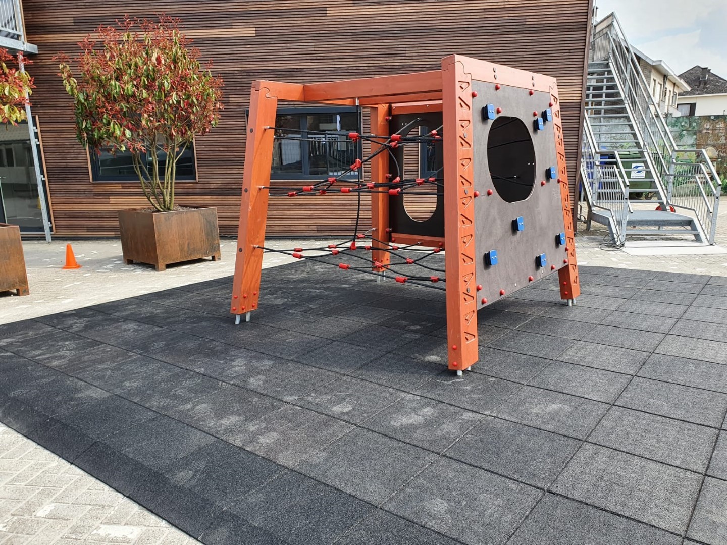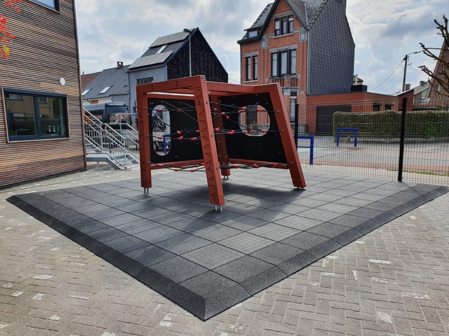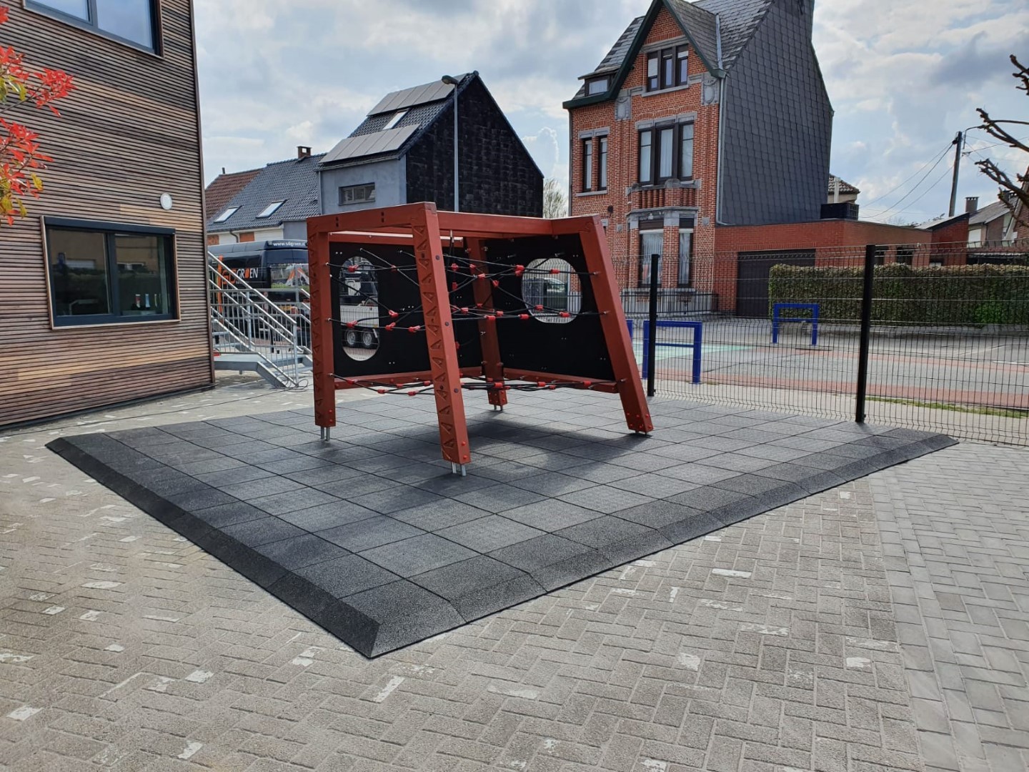 Weer een leuke klus in België, waar de directie van de school graag een klimtoestel vlakbij de ingang wilde hebben en waar tevens een valdempende rubbertegelvloer onder diende te komen van 6 cm dikte.
