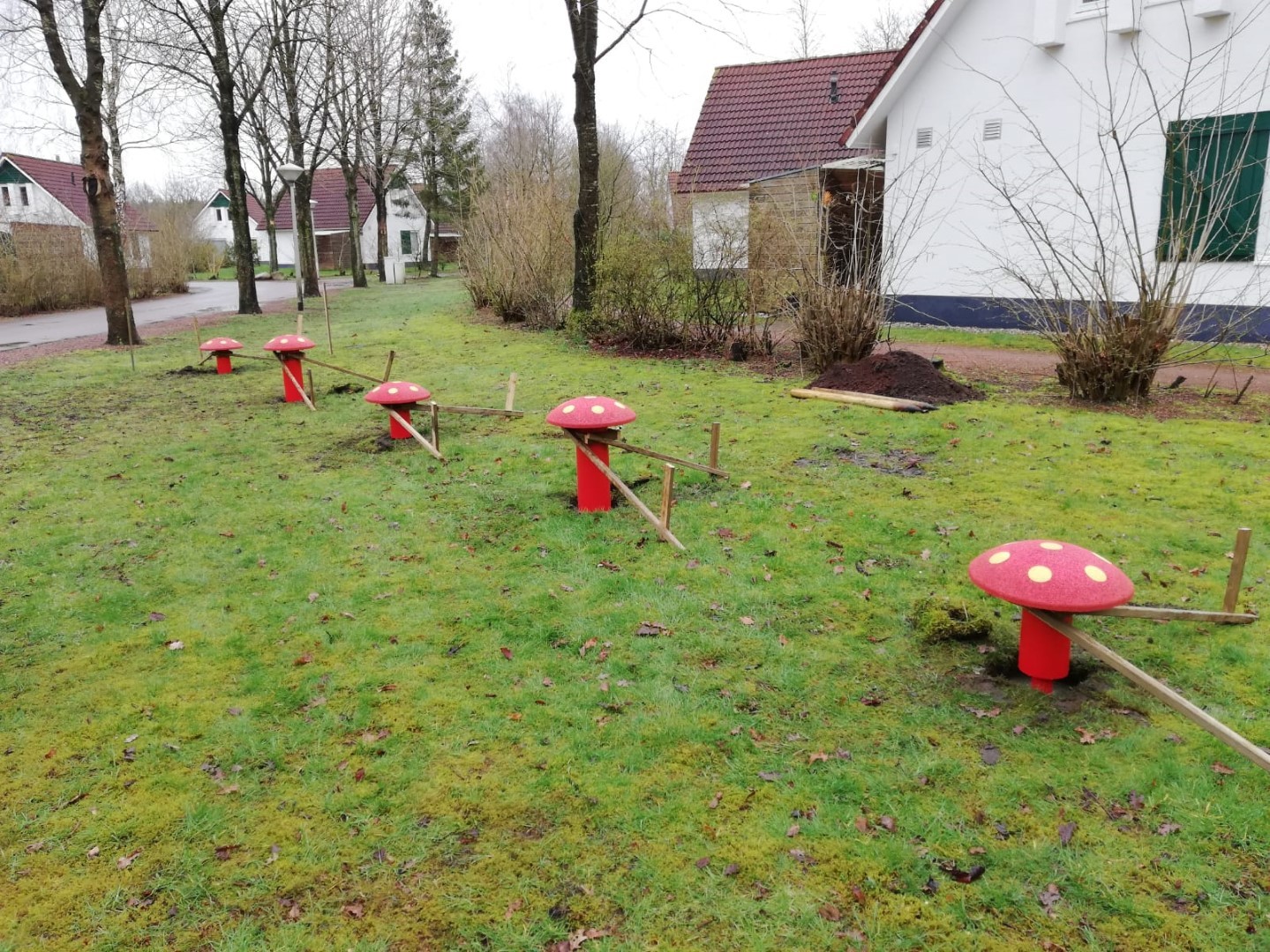 We hebben bij hen 5 paddestoelen geplaatst van ingekleurd, gerecycled rubber in de kleur rood met gele stippen. Er zijn meerdere kleurcombinaties mogelijk