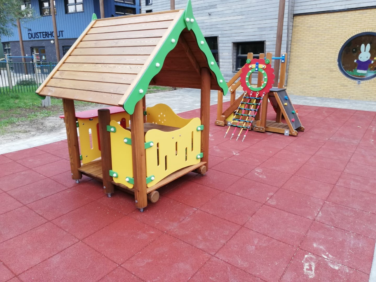 De speeltoestellen staan op een valdempende vloer van rubbertegels in de kleur rood.