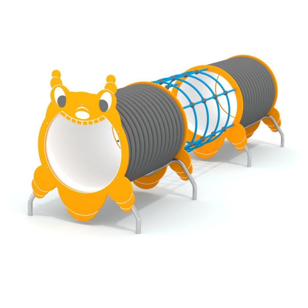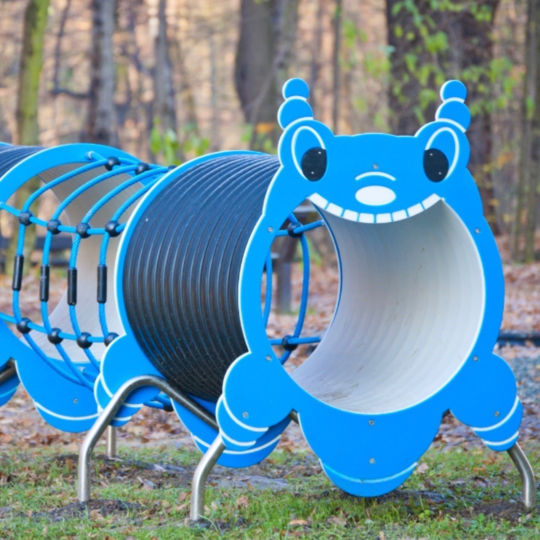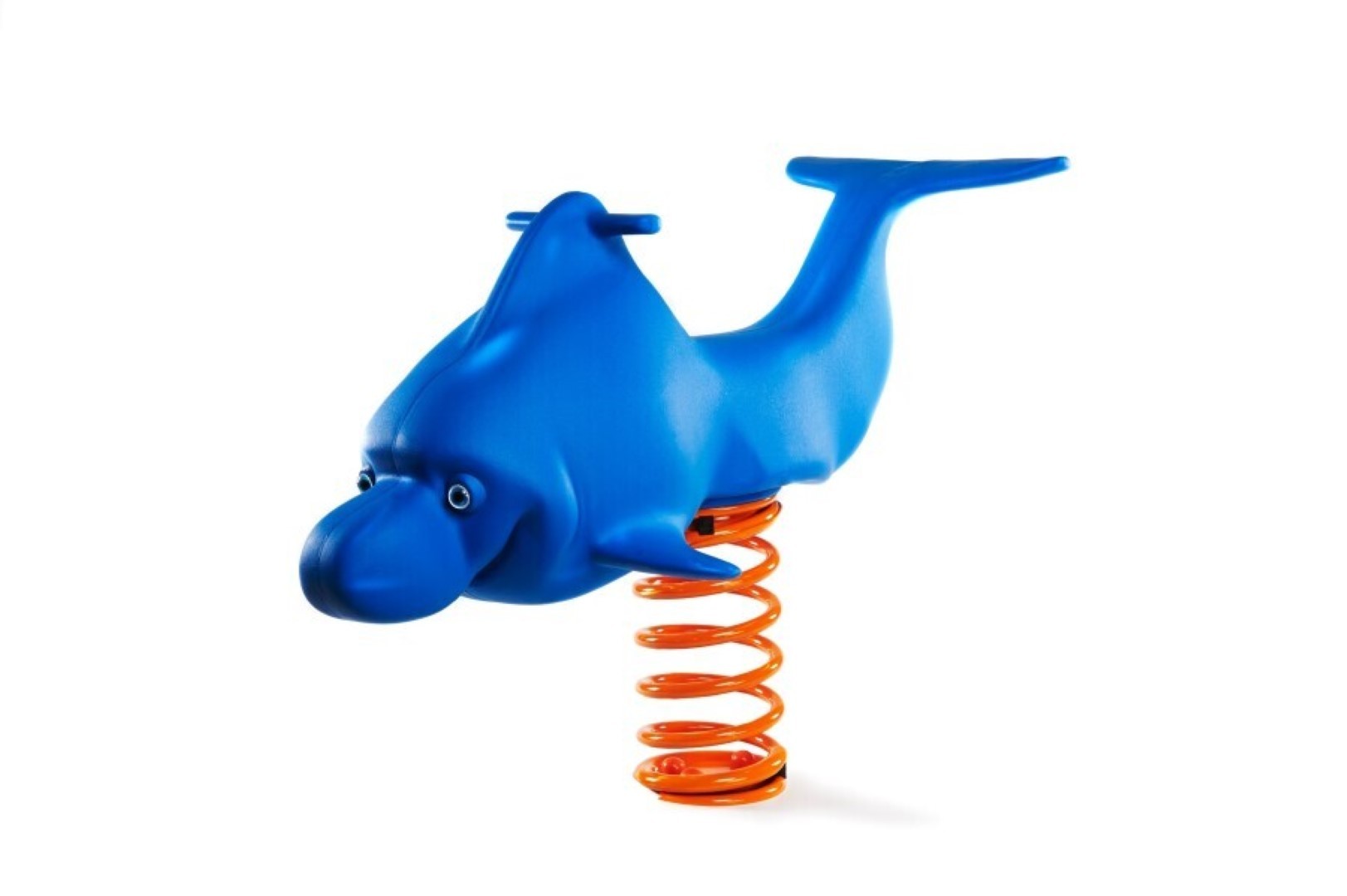 Holzhof veerfiguur dolfijn in een blauwe kleur en de Sapekor rups van RVS materiaal en polyethyleen beplating, ook in blauw. Ook leverbaar in oranje of rood.