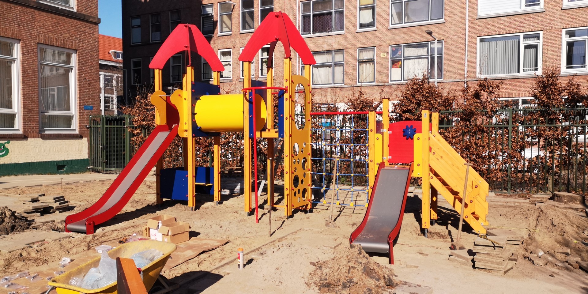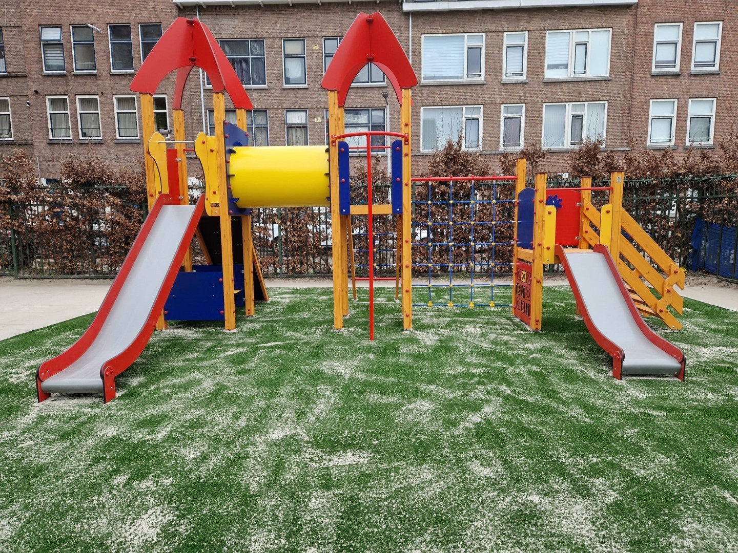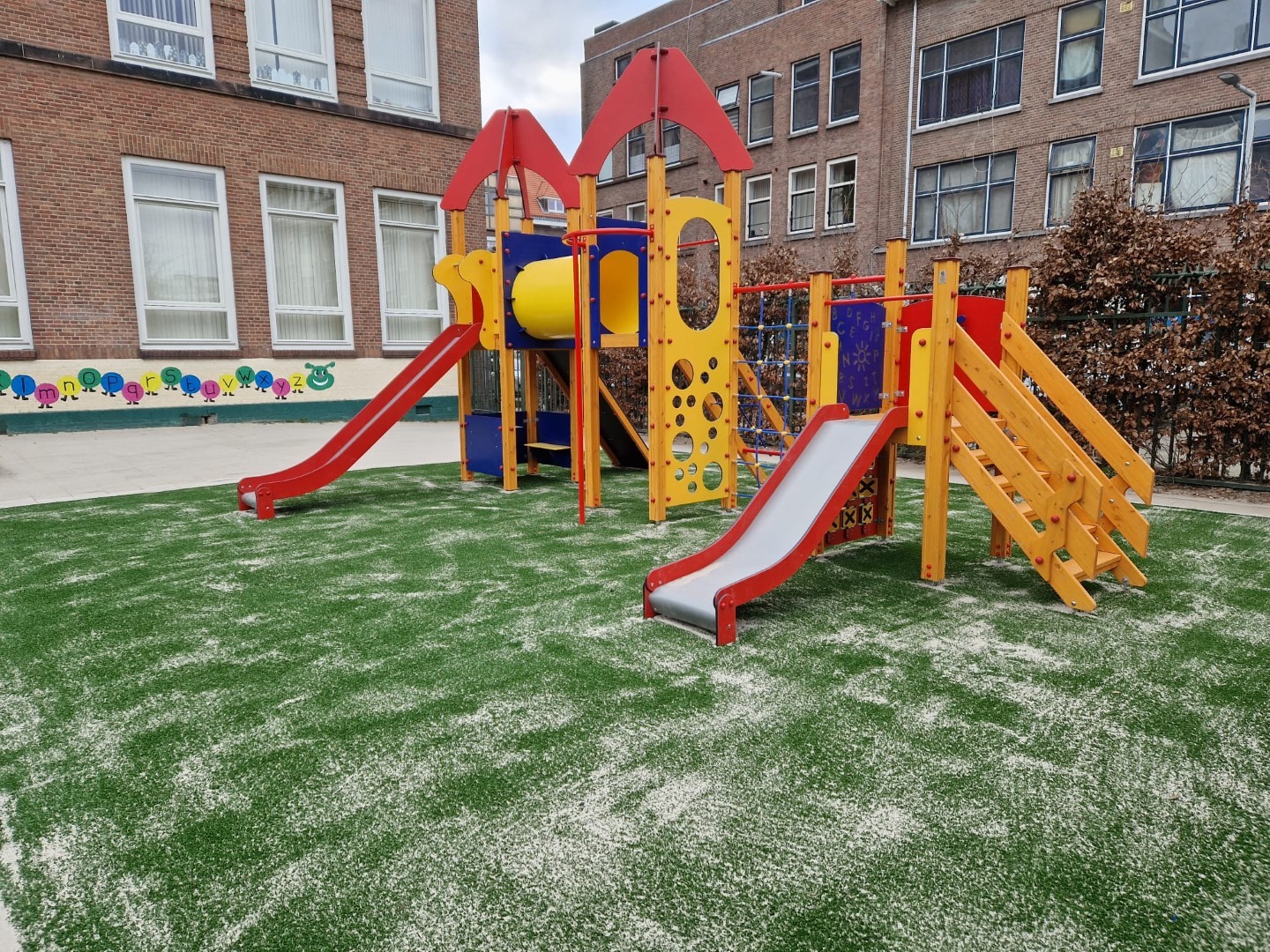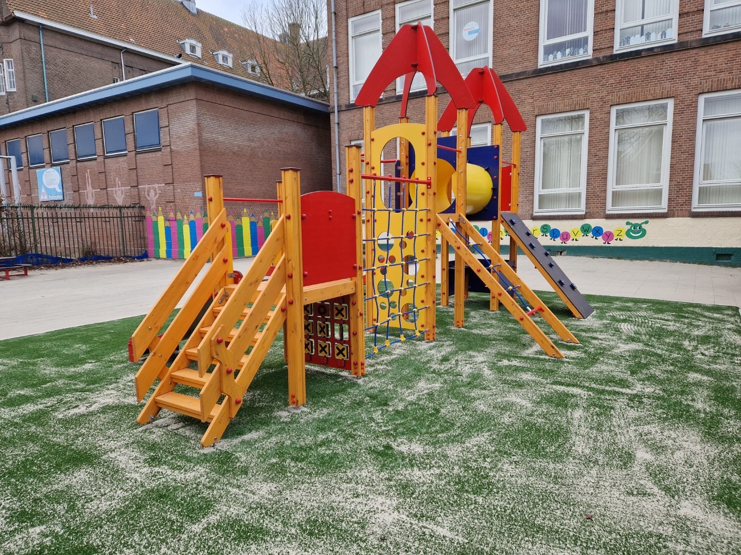 We werden benaderd door 2 enthousiaste dames van deze school die graag het oude speeltoestel en ondergrond kwijt wilden voor een nieuw speeltoestel met een valdempende ondergrond van kunstgras.