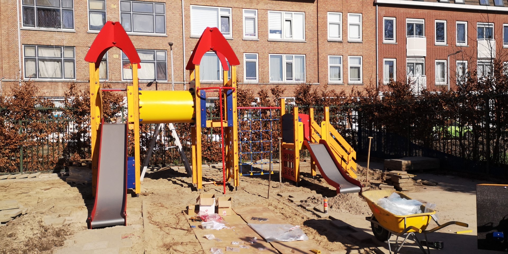 Nadat we het oude speeltoestel en ondergrond verwijderd hadden hebben we hier hun gewenste speeltoestel geplaatst en afgewerkt met een valdempende ondergrond van kunstgras.