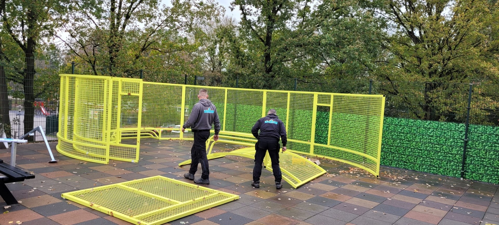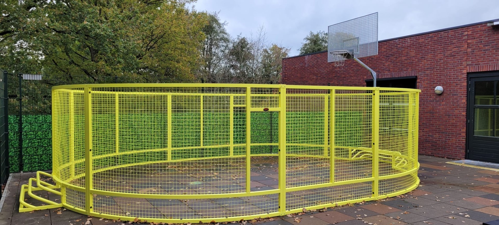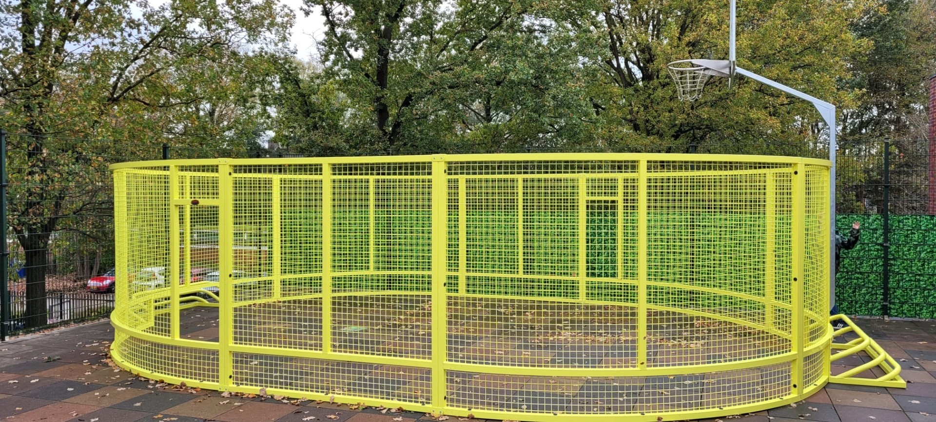 Op het dak van de Meidoornschool, waar veel kinderen zich in de pauzes vermaken wilde men graag een voetbalkooi met een basketbalconstructie laten plaatsen en deze bij voorkeur in een bij de school passende gele kleur en dat is gelukt.