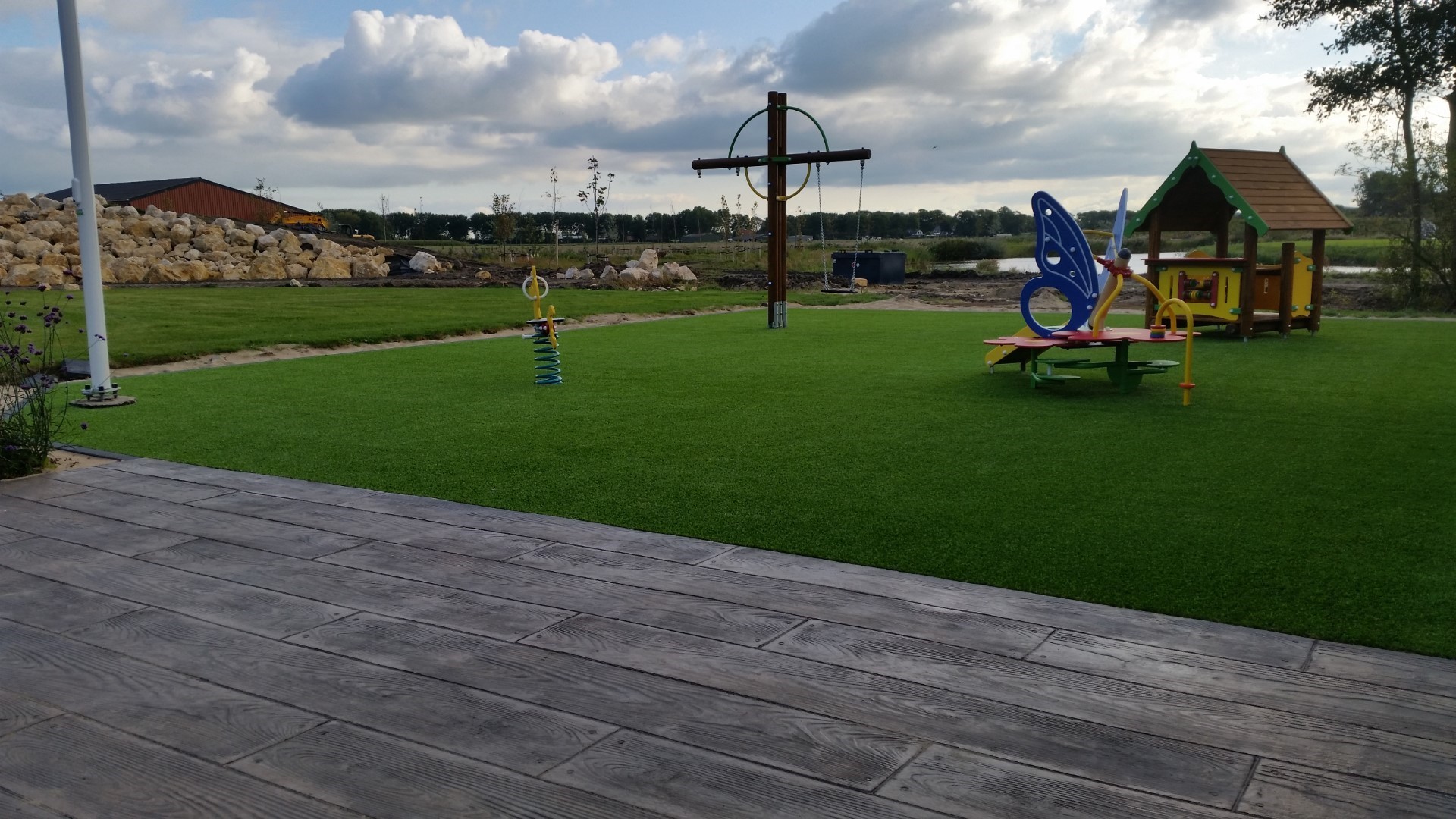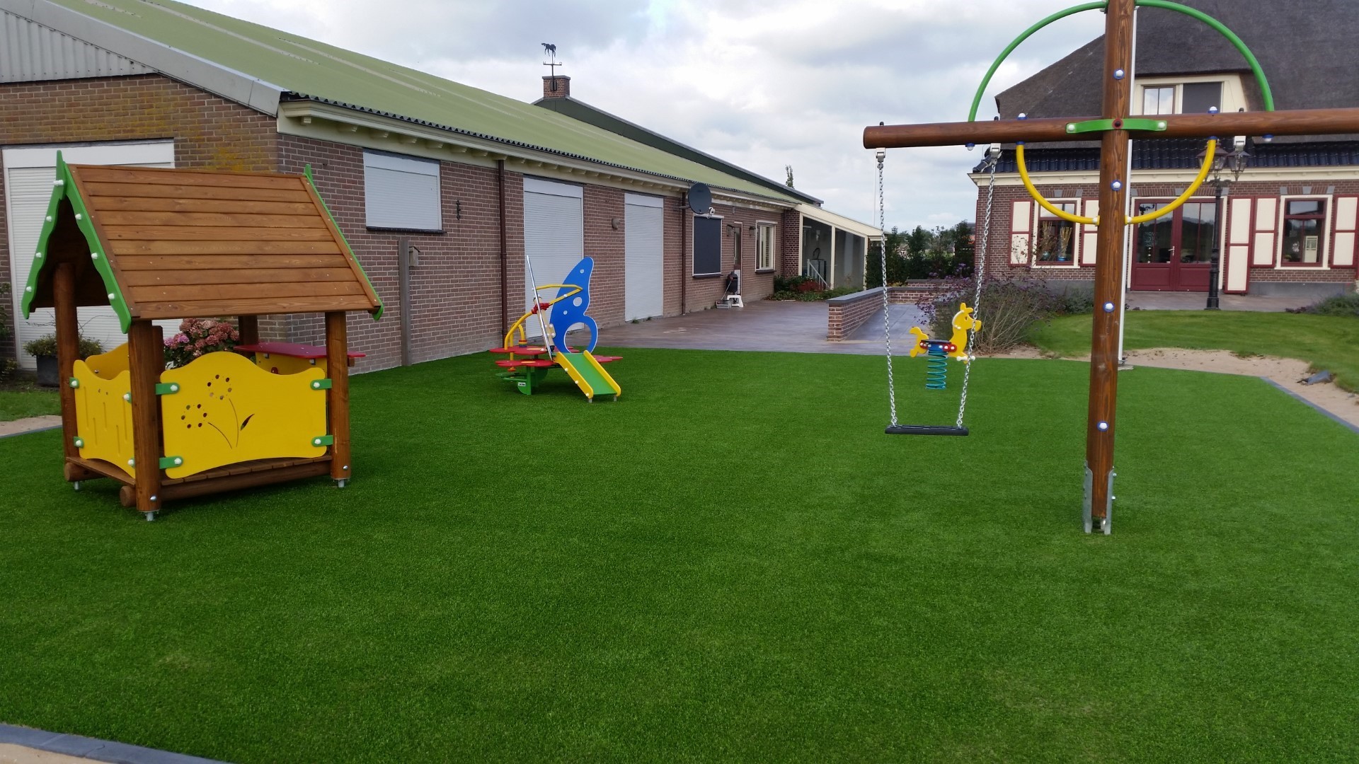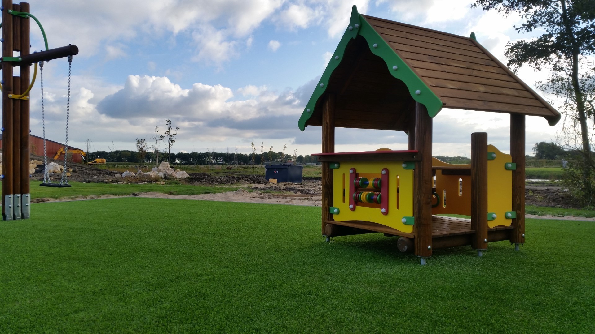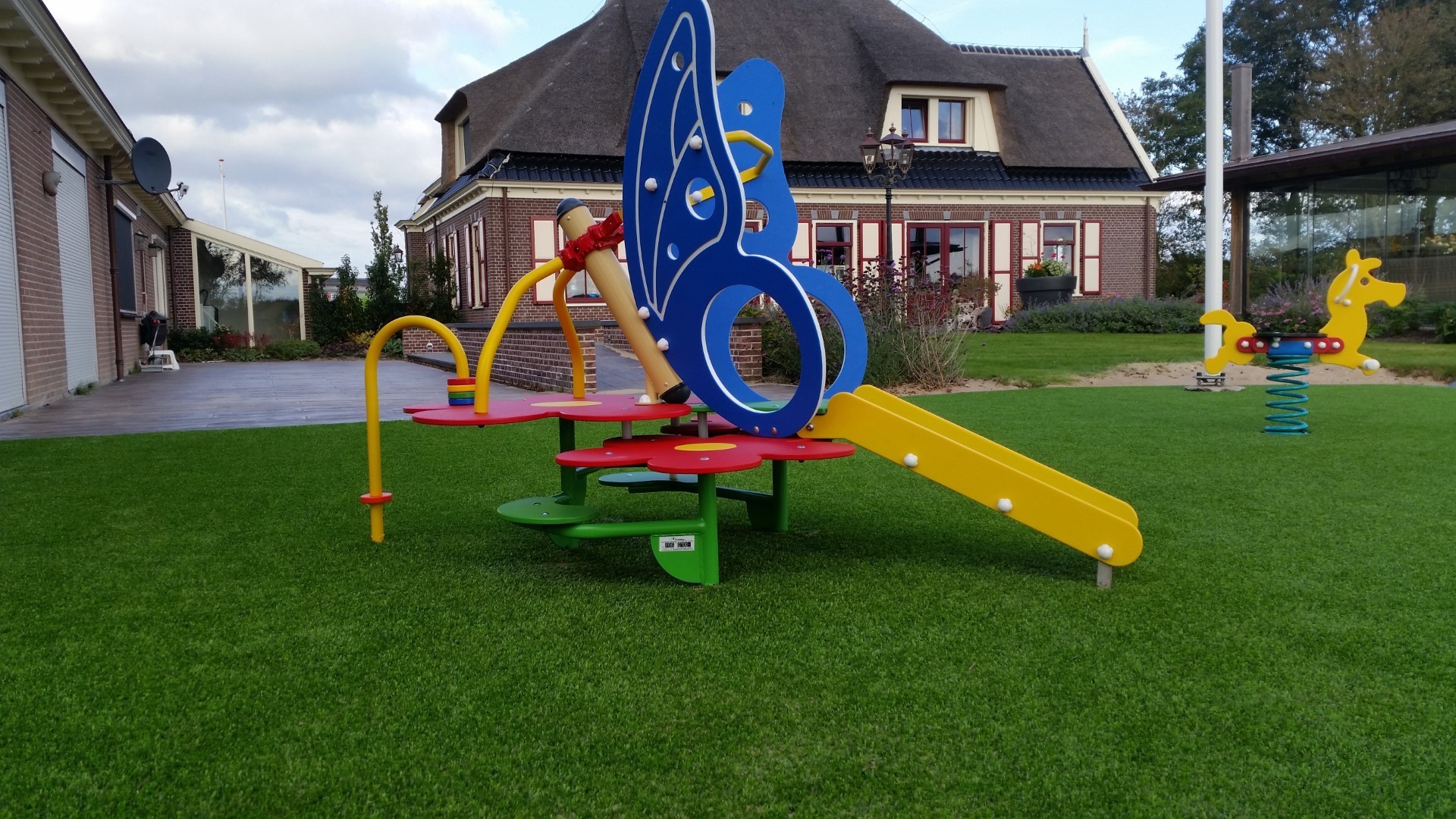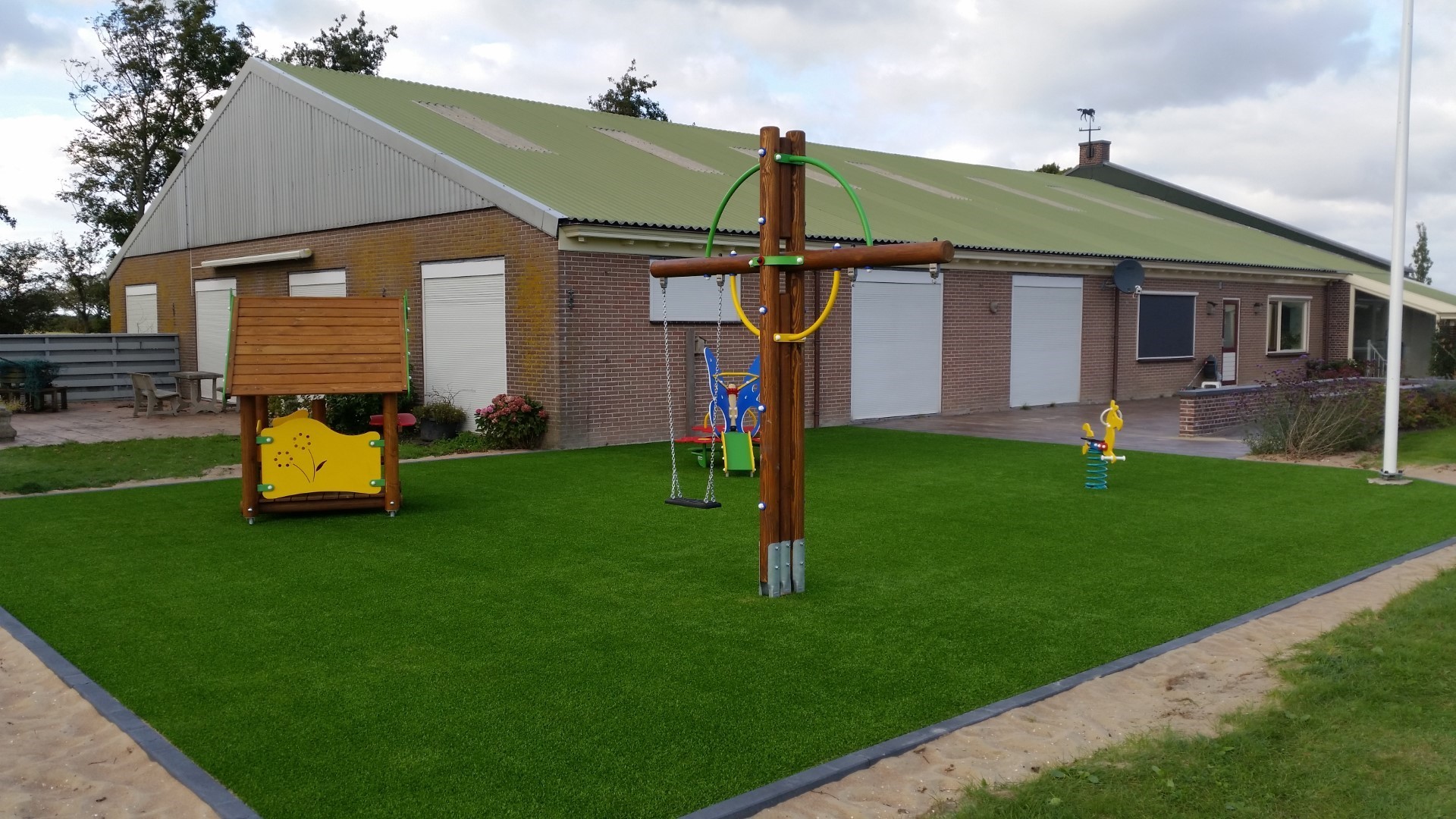 Deze kleurrijke speeltoestellen in combinatie met het kunstgras is een mooi geheel geworden waar de kinderen nog jarenlang plezier van zullen hebben.