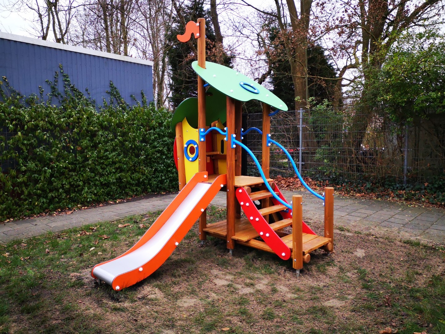 Kleurrijk speeltoestel voor kinderen van 2 tot 6 jaar. Het speeltoestel bestaat uit een speelhuisje met een platformhoogte van 84 cm waarvan een inox glijbaan met HDPE polyethyleen glijbaanboorden vertrekt. Het speelhuisje kan betreden worden via een gemakkelijke trap met metalen leuningen alsook via een antislip rotswand. Onderaan is een speelvloer voorzien, en bovenaan in het huisje is een bankje voorzien. Het geheel wordt overdekt door een 2-ledig dak uit afgeronde kleurrijke HDPE polyethyleen panelen. De rondhouten lariks palen hebben een diameter van 10 cm en worden met metalen voetsteunen in of op de grond bevestigd.