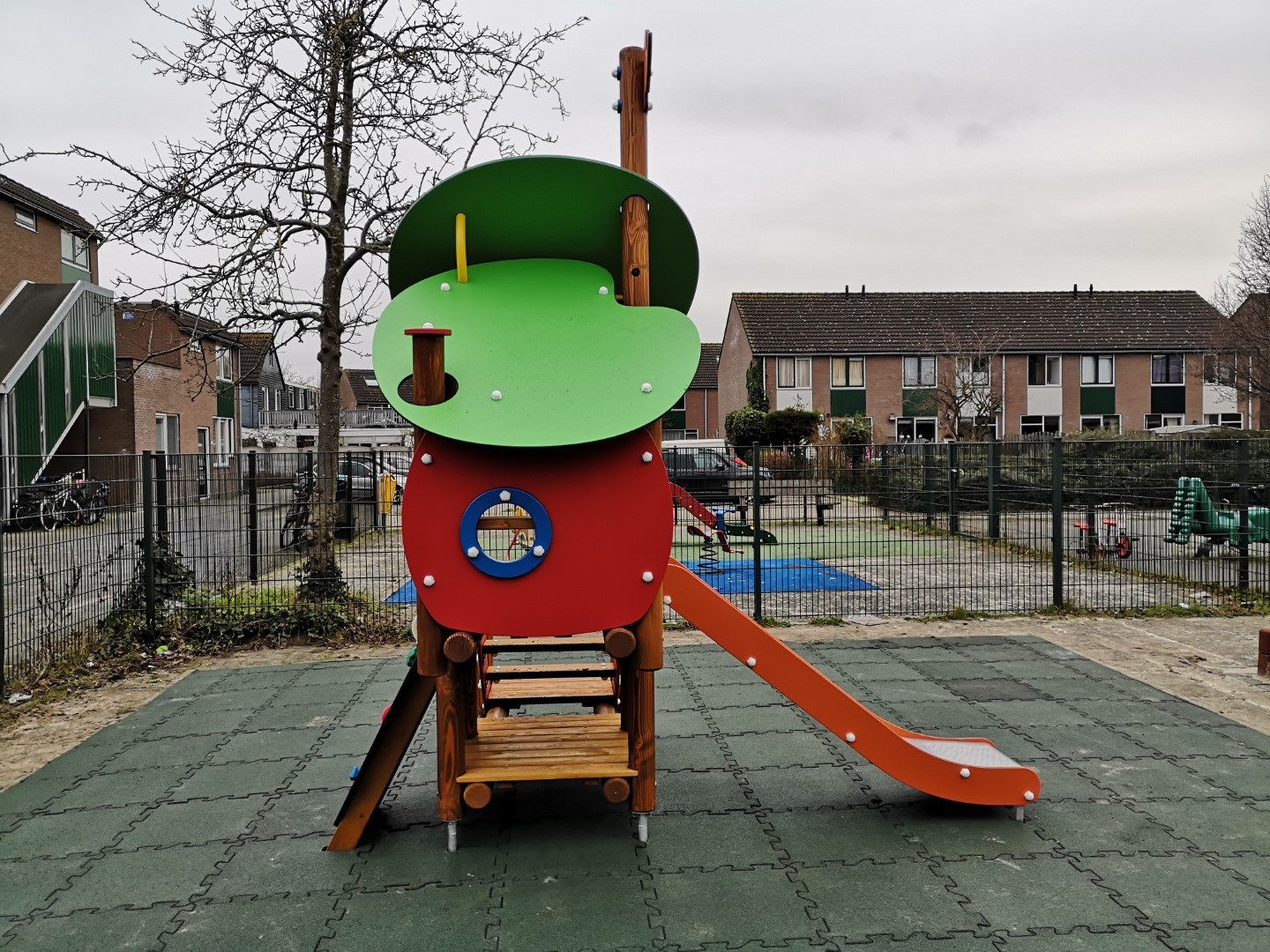 Er zijn nieuwe rubbertegels in de kleur groen gelegd zodat het weer mooie speelplekken geworden zijn.